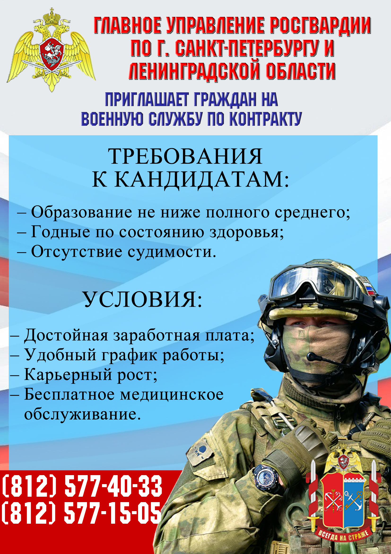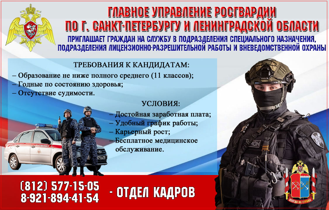 Главное управление Росгвардии по г.Санкт-Петербургу и Ленинградской области приглашает на службу по контракту (в т.ч. военную):